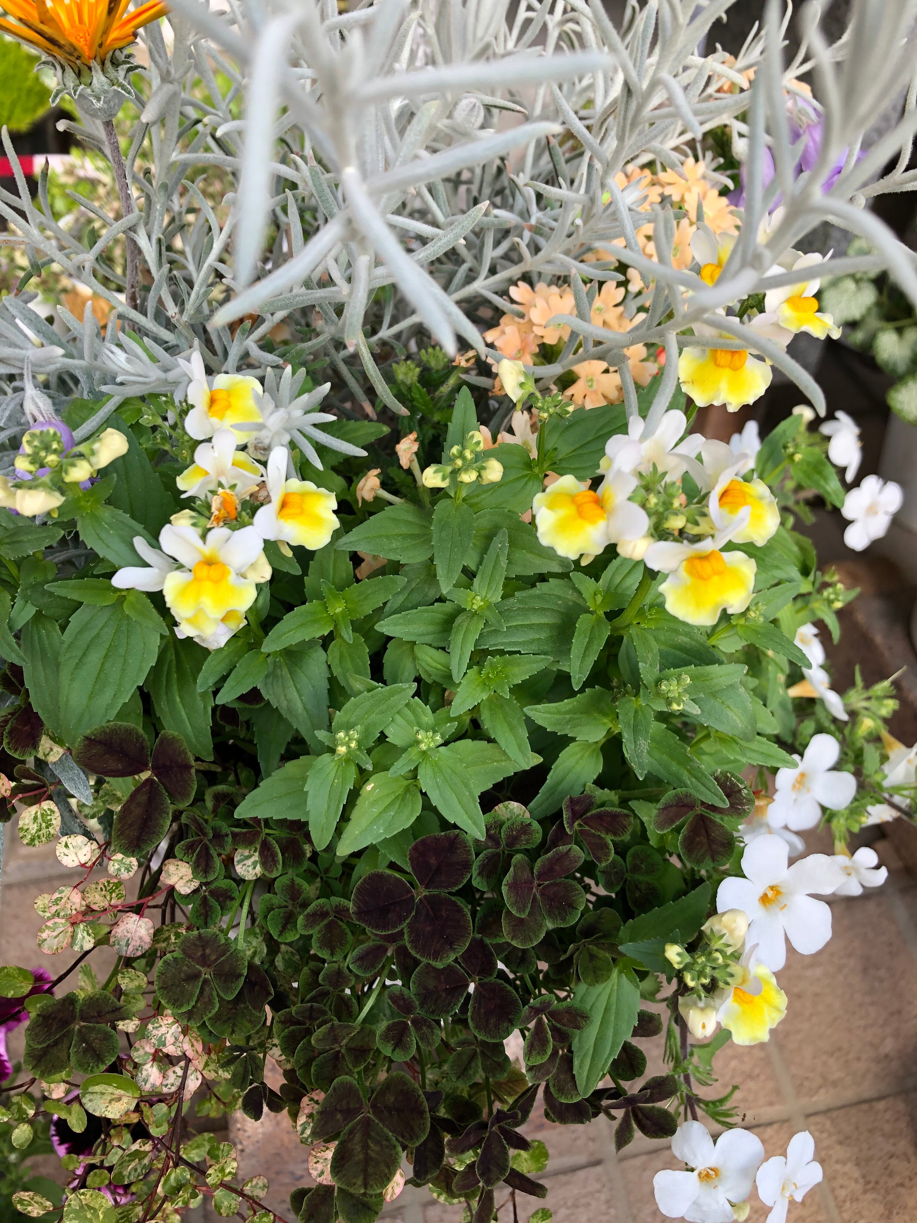 シルバーリーフが涼しげなニベアとガザニアが入った寄せ植えです。